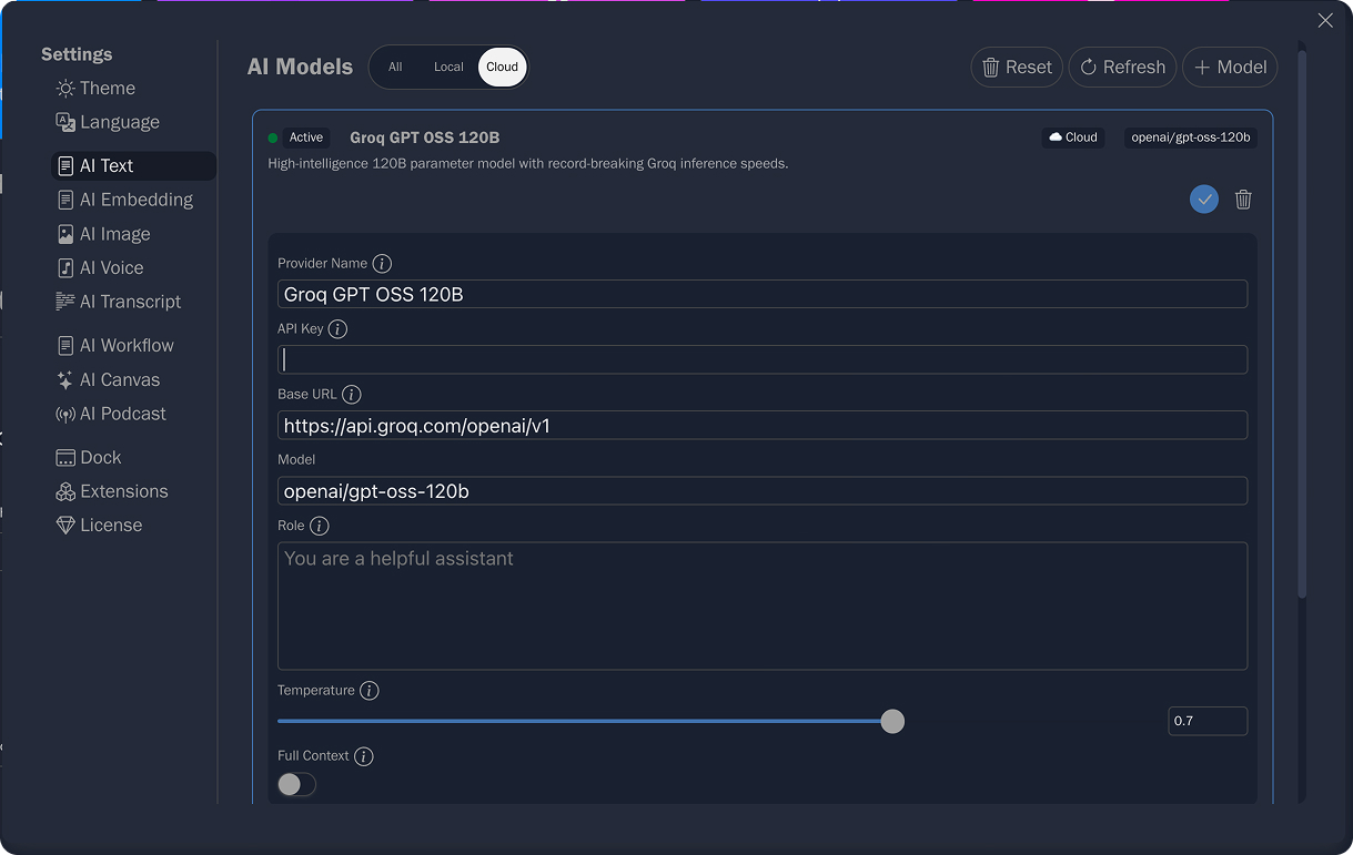 Provide a Base URL if you are using a provider other than OpenAI (e.g., https://api.groq.com/openai/v1).